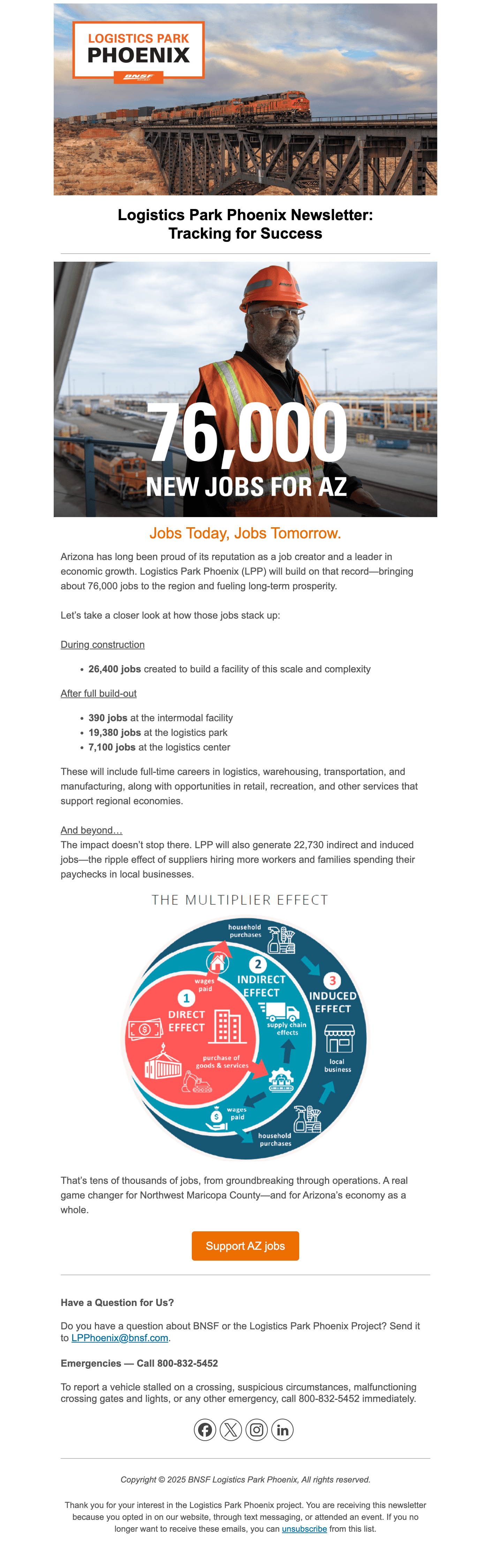 This edition emphasizes community benefits, highlighting how Logistics Park Phoenix will reduce train traffic through Northwest Maricopa communities by 2028—cutting waits at crossings, improving hospital access, and lowering emissions. It also notes that BNSF has requested to move the Maricopa County Board of Supervisors’ vote on the project’s comprehensive plan amendment from August 20 to November 5, ensuring more time for coordination with state and local partners and fuller public discussion later in the fall.
